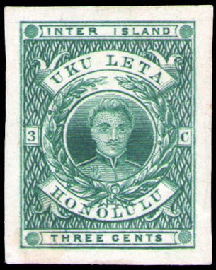 Lot 1244 E Hawaii, 1860, King Kamehameha III, 3¢ green, die essay on thin buff card (D'Assis SA3-TC5), 4 large balance margins, Very Fine. Estimate $250 - 350 Ordered by then Postmaster General Ava Clark for a projected 3¢ issue which was never implemented. |
