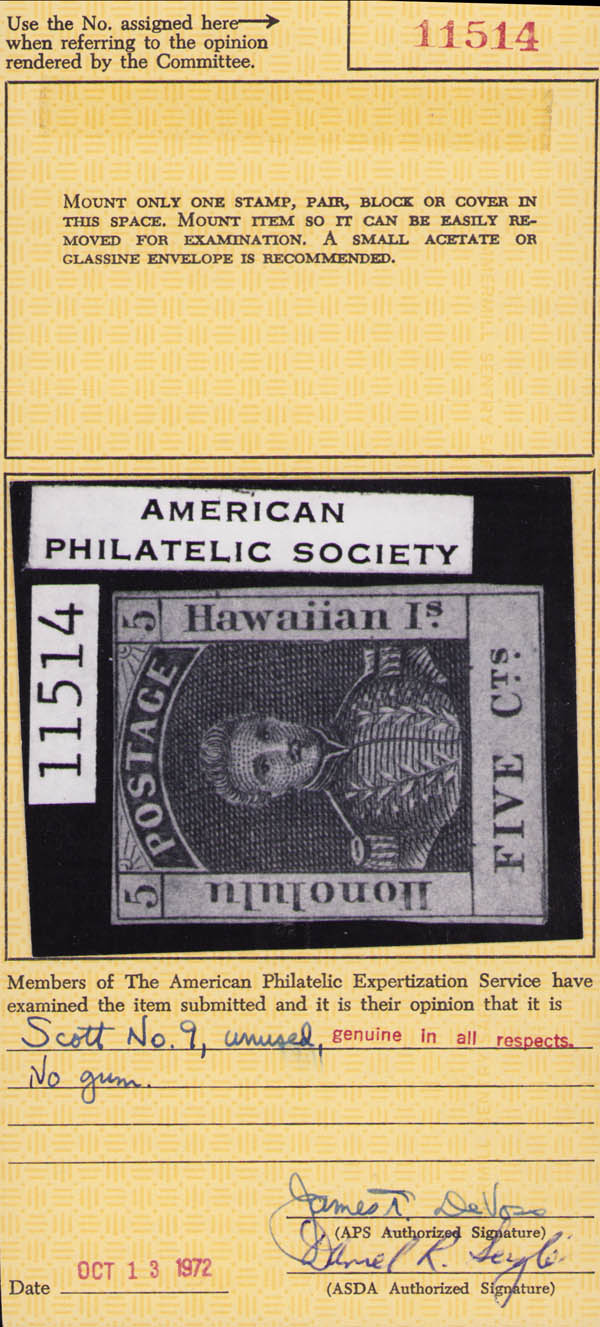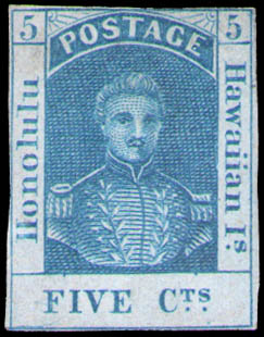 Hawaii, 1861, King Kamehameha III, 5¢ blue on thin bluish wove paper (Scott 9), 4 margins, unused without gum, Fine, with 1972 A.P.S. certificate. Scott $400 for o.g.