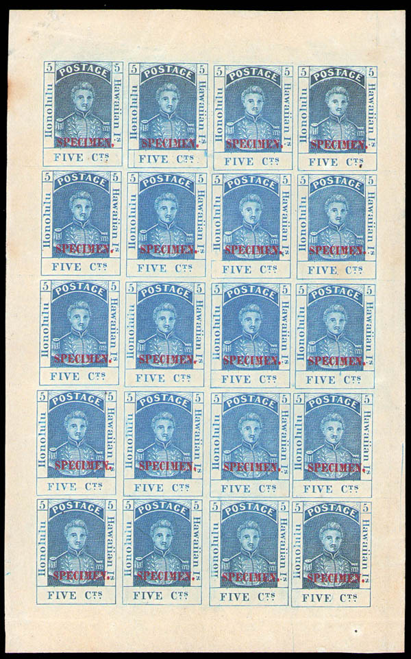 Lot 1247 S ![]() Hawaii, 1868, King Kamehameha III, 5¢ blue, re-issue, overprinted "Specimen" (Scott 10SA), complete pane of 20, o.g., 17 stamps never hinged, hinge remnants at top left and at bottom; top left stamp with hinge thin and a bit of minor browning in the top left margin, otherwise Very Fine. Scott $620. Estimate $200 - 300. |