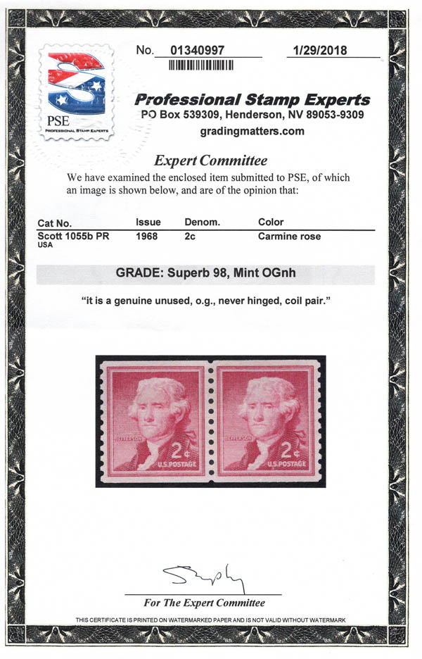 Lot 125![]() ![]() 1968, Liberty Issue, 2¢ Jefferson, horizontal coil, tagged, small perf. holes, shiny gum (Scott 1055b), a perfectly centered pair, o.g., never hinged, Superb, with 2018 P.S.E. certificate graded SUP 98. SMQ $100. Estimate $75 - 100. |