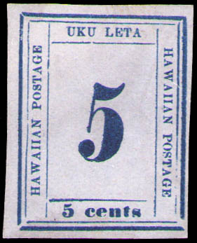 Hawaii, 1865, Numeral, 5¢ blue on blue (Scott 21), position 9-A-IX, 4 nice margins, fresh, unused without gum, nearly Very Fine. Scott $900.