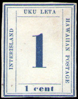 Hawaii, 1865, Numeral, 1¢ dark blue (Scott 25), position 11-A-V, 4 margins, fresh, unused without gum, Fine. Scott $350.