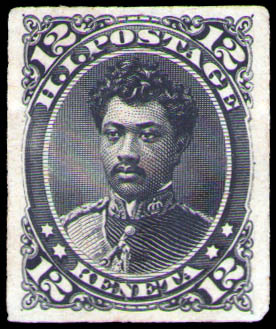 Hawaii, 1875, Prince William Leleiohoku, 12¢ black, plate proof on India paper (Scott 36P3), 4 nice margins, fresh; a trivial inclusion on the reverse, Very Fine. Scott $400.