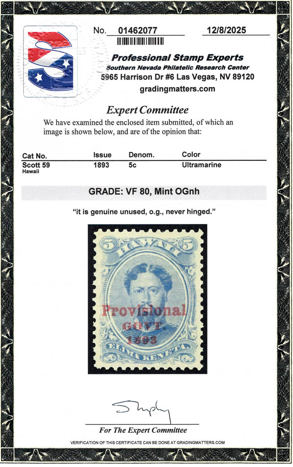 Lot 1275![]() ![]() Hawaii, 1893, Provisional Govt., 5¢ deep indigo and 5¢ ultramarine, red overprint (Scott 58, 59), o.g., never hinged, Very Fine, with 2025 P.S.E. certificates, each graded VF 80. Scott $47. Estimate $60 - 80. |