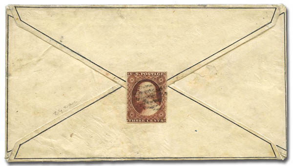 Lot 13![]() 1852, 3¢ Washington, dull red, type I (Scott 11), 3½ margins, used on the reverse of a lovely illustrated French comic envelope inscribed "partie de plaisir" (pleasure party), addressed to Tennessee. Indistinct town cancel at top right; cover repaired, attractive Fine appearance, very scarce. Estimate $400 - 600. |