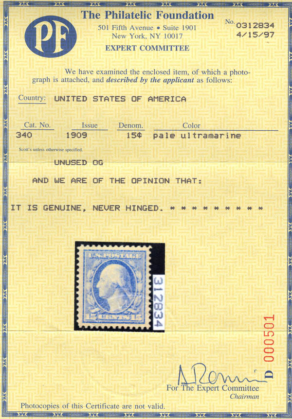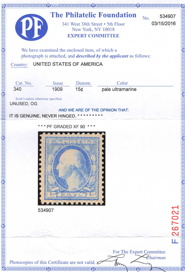 Lot 132![]() ![]() 1909, 15¢ Washington, pale ultramarine, D.L. watermark (Scott 340), very bright and fresh, o.g., never hinged, Extremely Fine, with 1997 P.F. and 2016 P.S.E. certificates, the latter graded XF 90. Scott $160. SMQ $375. Estimate $250 - 350. |