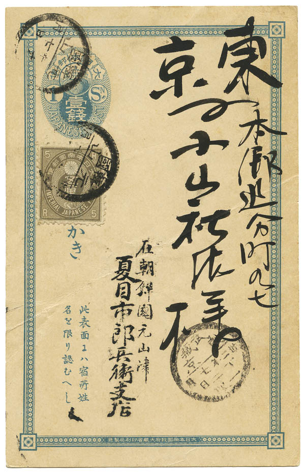 Lot 135![]() Japan, Used in Korea, 1899, a 1s Koban postal card from Weonsan, Korea to Tokyo, Japan, uprated with 5r Koban stamp, with Tokyo transit and backstamp. A very light cover crease, Fine to Very Fine overall. Estimate $75 - 100. |