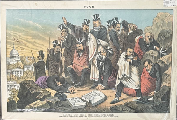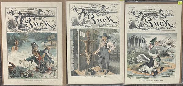 Lot 147 Political Memorabilia, 1876-1918, Puck Magazine, political cartoons. Puck was the first successful humor magazine in the United States of colorful cartoons, caricatures and political satire of the issues of the day. It was founded in 1876 as a German-language publication by Joseph Keppler, an Austrian immigrant cartoonist. Puck's first English-language edition was published in 1877, covering issues like New York City's Tammany Hall, presidential politics, and social issues of the late 19th century to the early 20th century. Artists represented are Keppler, Gillam, Pughe, Ehrhart and Opper to name a few. These were printed weekly. Some of these sell on eBay for $10 to $50 each! Three magazine covers from 1882, '85 and '86 which are fairly rare plus approximately 70 unique colorful centerfolds. Most in good to excellent condition. We have imaged a few to give a flavor of the lot. Estimate $300 - 400. |