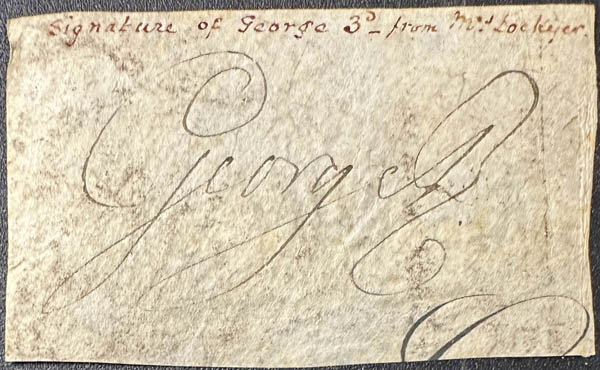 Lot 16 George III, (1738-1820), King of England. Cut signature fragment purportedly from King George III of Great Britain. The handwritten note at the top "Signature of George 3rd - from Mr. Lockyer" suggests that this piece was clipped from a larger official document or ledger, possibly by a collector or archivist in the 19th century as this was a common practice; this item was purchased from Herb LaTuchie's House for Collectors decades ago. No COA but certainly a neat item worth authenticating! If this is a facsimile it is still worth our estimate but if genuine this could be a real find! Estimate $100 - 150. |