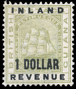 British Guiana, 1888, "INLAND REVENUE", $1 green (SG 185. Scott 124), well centered, unused without gum, Very Fine. Catalog values are for o.g. SG £500 ($640). Scott $575.