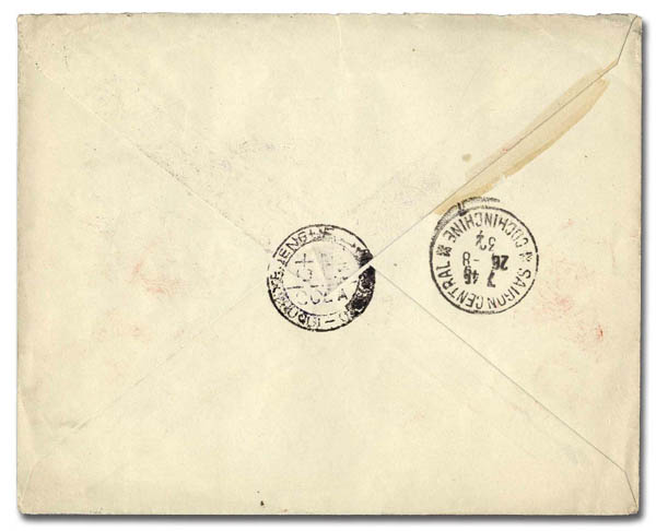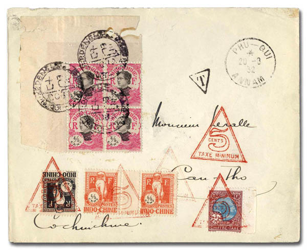 Lot 167![]() French Colonies: Indochina, 1932, local cover, bearing issues for French Indo-China tied by triangular "5 cents - TAXE MINIMUM" handstamp, alongside PHU-QUI*ANNAM c.d.s., Fine to Very Fine, ex Desrousseaux. Estimate $80 - 120. |