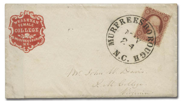 [College] Wesleyan Female College, Murfreesboro, N.C., embossed cameo corner card on a beautiful cover to a college in Virginia, Very Fine. Scott 26.