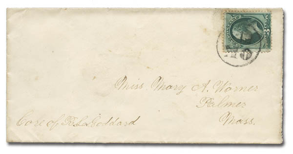 "OK" in Circle, bold strike ties 3¢ green on cover to Palmer, Mass., Fine to Very Fine, an unusual cancel. Scott 147. Cole unlisted.