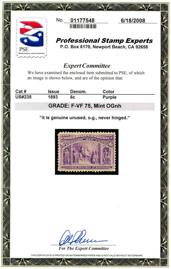 1893, 6¢ Columbian (Scott 235), o.g., never hinged, Fine to Very Fine, with 2008 P.S.E. certificate graded F-VF 75. Scott $150. SMQ $100.