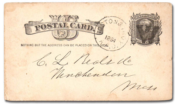 Letter "W" (Boston & Troy Railroad), nice strike on a 1¢ postal card to Mass., Fine to Very Fine.
