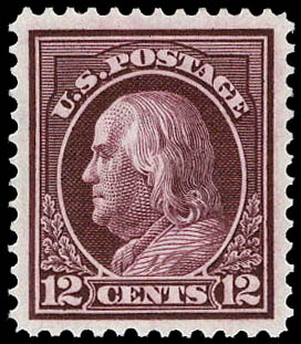 1914, 12¢ Franklin, claret brown, S.L. watermark, perf. 12 (Scott 417), a gem with essentially perfect centering, o.g., never hinged, Extremely Fine to Superb. Scott $100.
