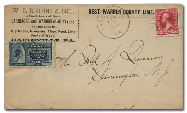 Lot 176![]() Special Delivery, 1888, 10¢ blue (Scott E2), used with 2¢ postage on an 1894 advertising cover for a dealer in "carriages and wagons of all style, also dry goods, groceries, lime etc.", with 2 backstamps. A nice clean cover, Fine to Very Fine. Scott $135. Estimate $60 - 80. |