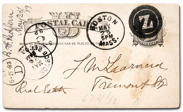 Letter "Z" (Boston), beautiful strike on a 1¢ postcard; corner creases in both upper left and right, Fine to Very Fine.