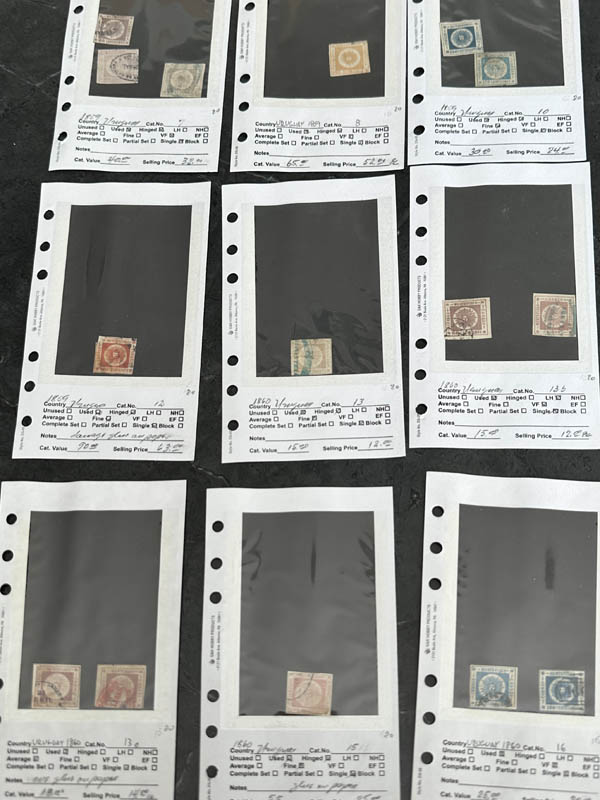 Lot 179 /oUruguay, 1858-2019, a dealer's stock of mint and used, containing singles, pairs, blocks, strips, booklets complete sets, souvenir sheets and miniature sheets, housed in a total of 36 different binders, all identified by Scott number with a catalog value. Occasional faults, otherwise generally Fine or Fine to Very Fine. We have imaged the first few binders of regular issues plus airmails, parcel posts and officials to give a flavor of the lot. Also included is a listing of the range of Scott numbers in each binder as well as the approximate catalog value. Scott approximately $17,000. Estimate $800 - 1,200. |