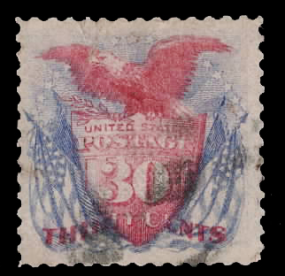 1869, 30¢ ultramarine & carmine (Scott 121), well centered, faintly canceled, Very Fine.