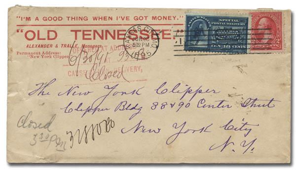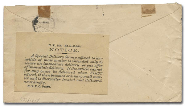 Lot 180![]() Special Delivery, 1894, 10¢ blue, unwatermarked (Scott E4), used with 2¢ postage on an 1895 cover from Kansas City to New York, not delivered because the recipient's office was closed. Reverse bears a printed New York label explaining the special delivery service (from the 5th printing of these labels), Fine to Very Fine. Scott $300 ++. Estimate $200 - 300. |