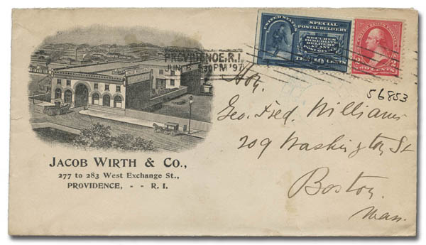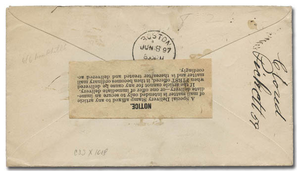 Lot 183![]() Special Delivery, 1895, 10¢ blue (Scott E5), natural s.e. at left, used with 2¢ postage on a lovely advertising cover with Providence, R.I. 1897 machine cancel (an early usage of machine cancels), addressed to Boston and not delivered because the recipient's office was closed. Reverse bears a printed Boston label explaining the special delivery service, Very Fine, a very scarce usage. Estimate $100 - 150. |