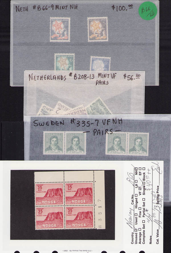 Lot 183![]() Worldwide, 1880's-1980's, a mostly mint assortment, mainly Scandinavia and Netherlands, but also including some Egypt and Ethiopia (for the sun birds no doubt), ranging from early definitives to booklets to modern year sets, mostly identified and on glassines or dealer's stock cards. A rambling lot with much variety to pore through, generally Fine to Very Fine. A small sample has been imaged. Shipping weight 2.25 lbs / 1 kilo. Estimate $100 - 150. |