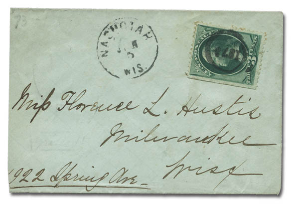 "1873" in Circle (Nashotah, Wis.), fine strike cancels 3¢ green on a lady's cover to Milwaukee, Fine to Very Fine. Scott 158. Cole YD-24.