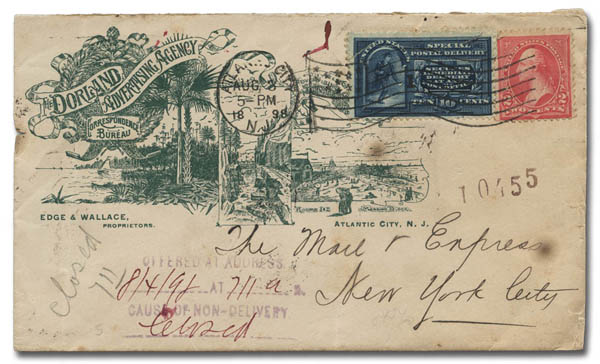 Lot 184![]() Special Delivery, 1895, 10¢ blue (Scott E5), used with 2¢ postage on a lovely 1898 advertising cover from Atlantic City, N.J. to New York, not delivered because the recipient's office was closed. Reverse bears a printed New York label explaining the special delivery service (from the 11th printing of these labels), plus Philadelphia transit cancel, Very Fine, a very scarce usage. Estimate $100 - 150. |