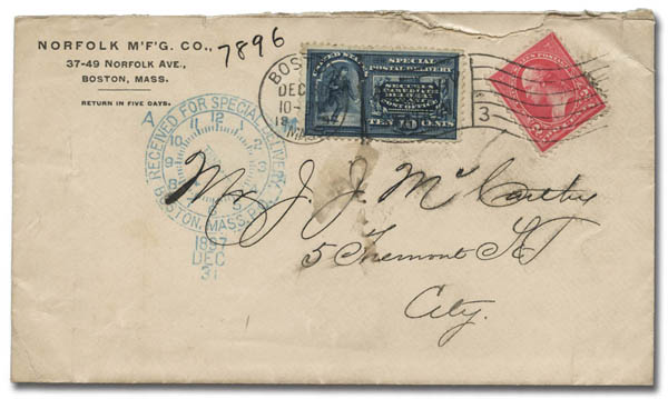Lot 185![]() Special Delivery, 1895, 10¢ blue (Scott E5), used with 2¢ postage on an 1897 cover from Boston, not delivered because the recipient's address was closed. Note the fancy special delivery postmark at left. Reverse bears a printed Boston label explaining the special delivery service. Cover roughly opened at top, Fine to Very Fine overall. Estimate $75 - 100. |