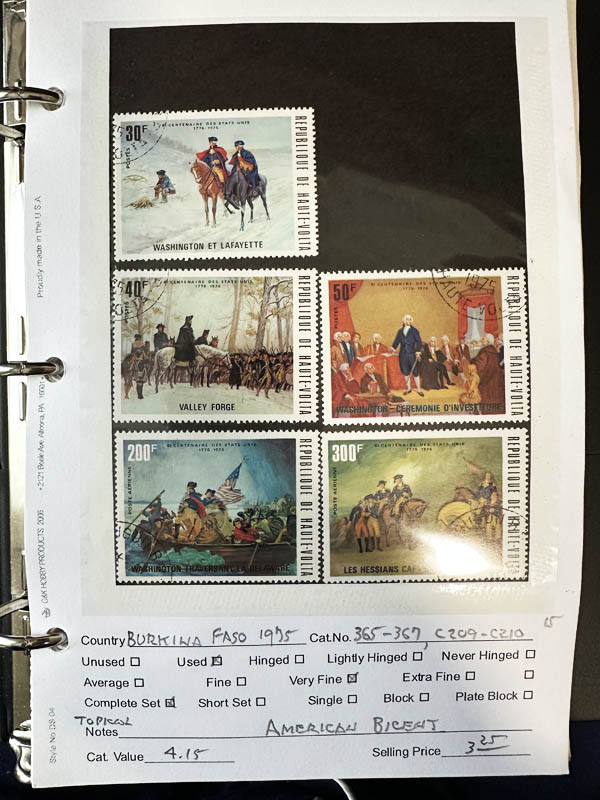 Lot 185 /oWorldwide, 1900's onward, an assortment of topicals, approximately 150+ singles, pairs, strips and blocks plus souvenir sheets, housed in three medium binders and mounted on stock ages, identified and catalogued for the most part and featuring topics such as the American Bi-Centennial, animals (lots of birds and butterflies), art, automobiles, aviation, children, Princess Diana, Europa, famous people, flowers, Red Cross, religion, scouting, space, sports, etc., from all around the globe. A plethora of things to choose from for the topical enthusiast! A few items have been imaged to give a flavor of the lot, overall Fine to Very Fine. Scott $2,449. Estimate $300 - 400. |