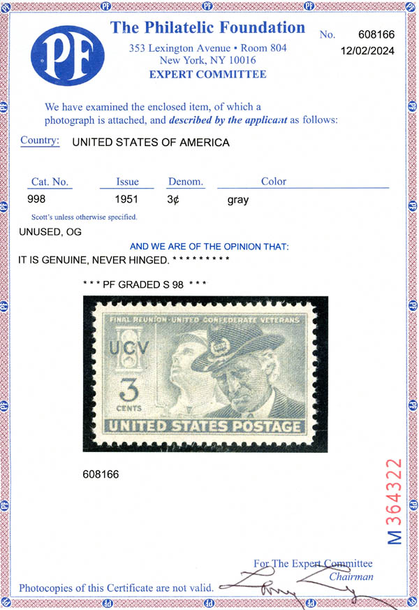 1951, 3¢ United Confederate Veterans (Scott 998), o.g., never hinged, Superb, with 2024 P.F. certificate graded SUP 98. SMQ $95.