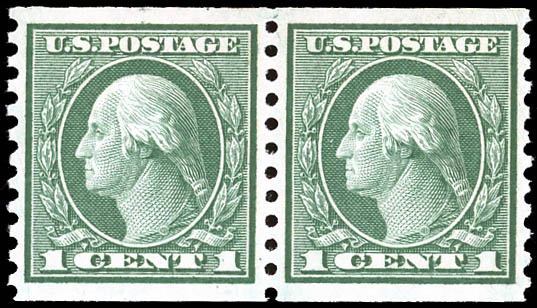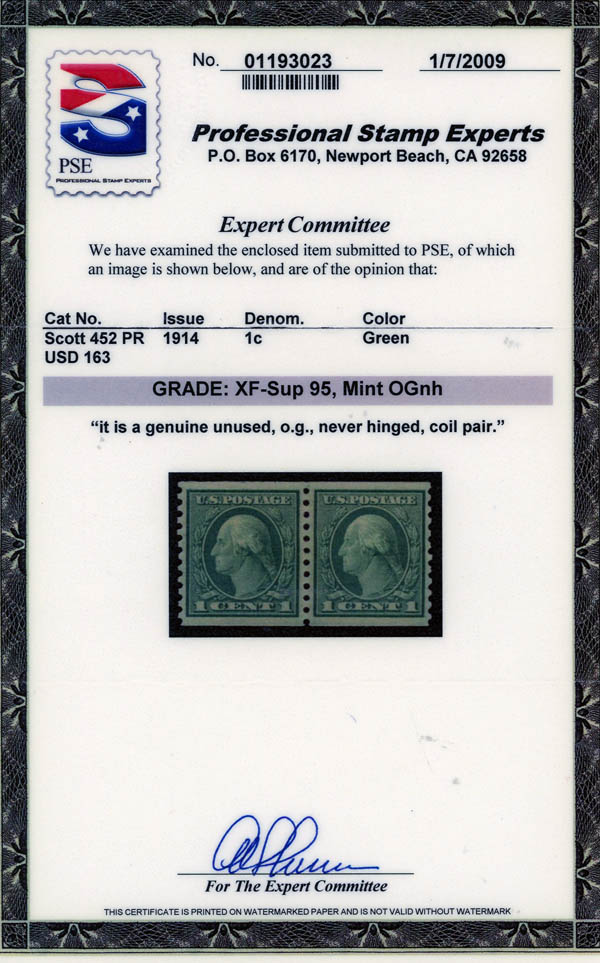 Lot 188![]() ![]() 1914, 1¢ Washington, green, S.L. watermark, rotary press coil, perf. 10 vertically (Scott 452), a beautiful pair, with uncommonly choice centering and bright fresh color, o.g., never hinged, Extremely Fine to Superb, with 2009 P.S.E. certificate graded XF-SUP 95. Scott $75. SMQ $220. Estimate $150 - 200. |
