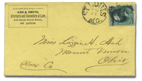 Eagle (St. Louis, Missouri), clear strike ties 3¢ Bank Note on cover to Ohio, with Attorney's corner card; slightly reduced at right, Very Fine. Scott 147. Cole Bi-1.