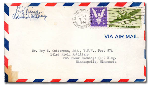 Lot 19 King, Admiral Ernest Joseph, (23 November 1878-25 June 1956) was Commander in Chief, United States Fleet (COMINCH) and Chief of Naval Operations (CNO) during World War II. As COMINCH-CNO, he directed the United States Navy 's operations, planning, and administration and was a member of the Joint Chiefs of Staff. Clear signature on a lovely airmail envelope sent Oct. 27, 1944 from the U.S. Fleet Post Office, Washington D.C. Estimate $50 - 75. |