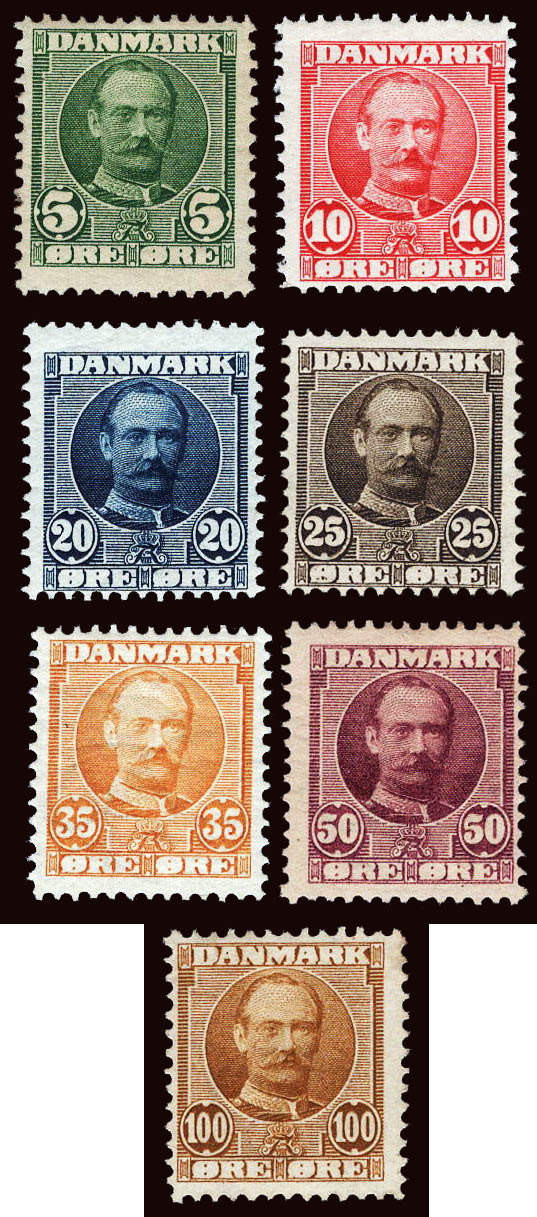 Scandinavia: Denmark, 1907-12, King Frederick VIII, 5ø to 100ø complete (Scott 72-78), o.g., hinged, Fine to Very Fine. Scott $201. Michel 53-59. Facit 69-75.