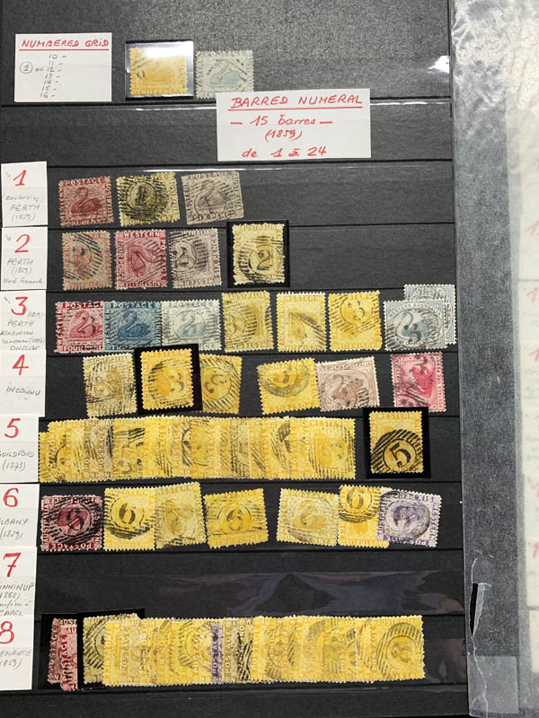 Lot 2 o Australian States: Western Australia, Postmarks, 1859-1901, extensive specialized collection / accumulation, approximately 600-700 stamps, neatly organized on stock book pages, and grouped by type of cancel and city: numerals in grids, barred numerals, letters, c.d.s.'s, etc., mainly 1d to 6d denominations. No rare stamps but huge catalog value in total, generally Fine, a magnificent collection for the serious specialist or dealer. SG approximately £2,000 ($2,370). Estimate $250 - 350. |