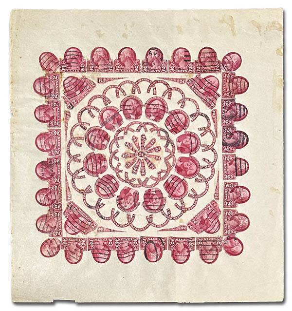 Lot 2 A work of stamp art, using a collage of approximately 50 of the 1923 2¢ Washington stamps to create a lovely visual design, suitable for framing; a meticulous endeavor that must have taken many hours to create! Estimate $50 - 75. |