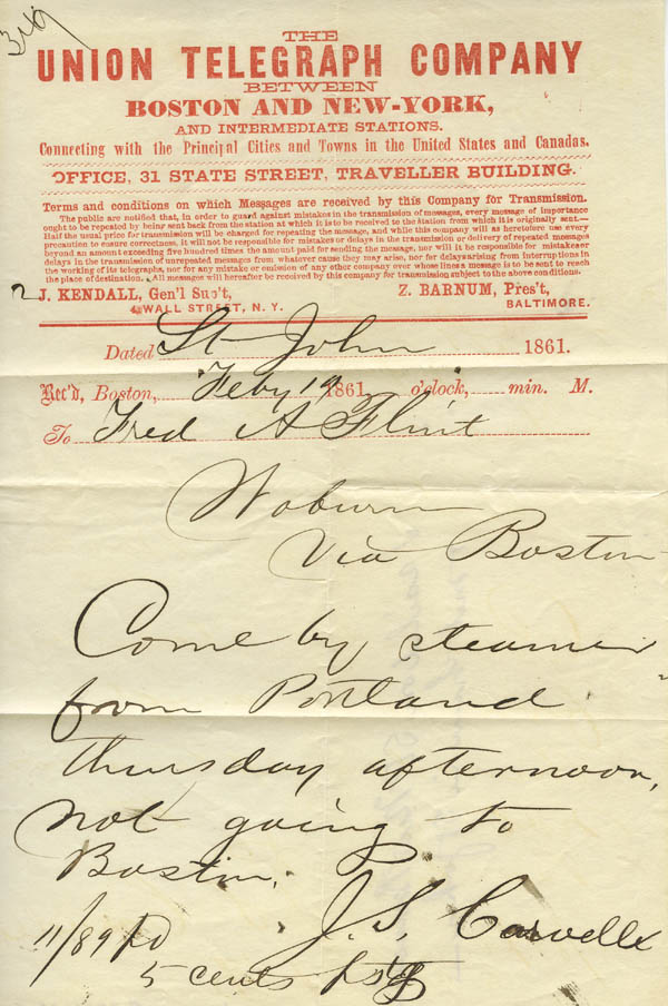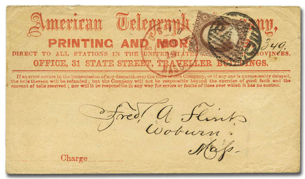 Lot 20![]() 1857, 3¢ Washington, brownish carmine, type IV (Scott 26A var.), natural s.e. at right, tied by Boston PAID cancel on a cover with a fancy corner card for the American Telegraph Company, and with a similar letterhead for the Union Telegraph Company on the enclosed letter, Fine to Very Fine. Estimate $120 - 180. |