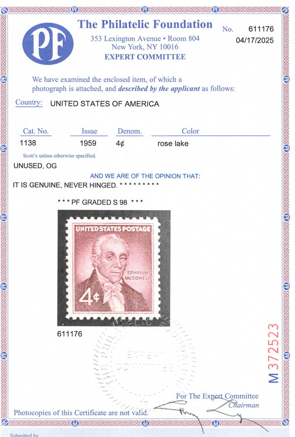 1959, 4¢ Dr. Ephraim McDowell (Scott 1138), o.g., never hinged, Superb, with 2025 P.F. certificate graded SUP 98. SMQ $70.