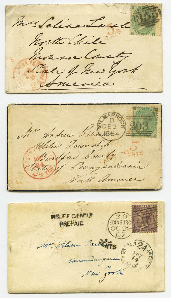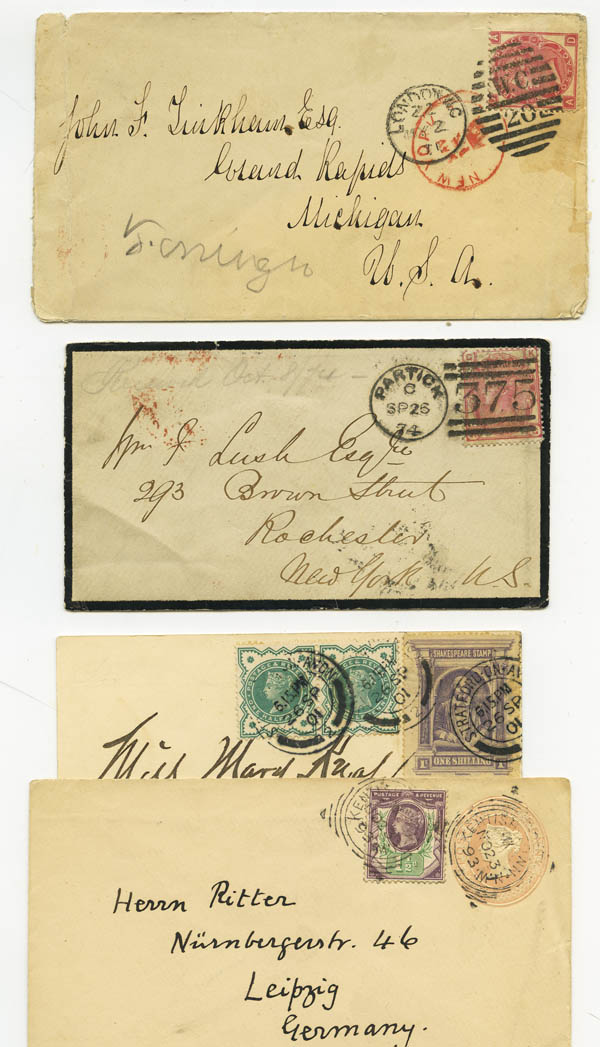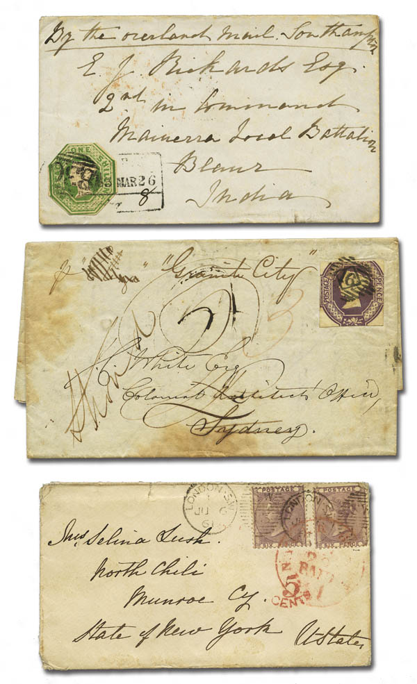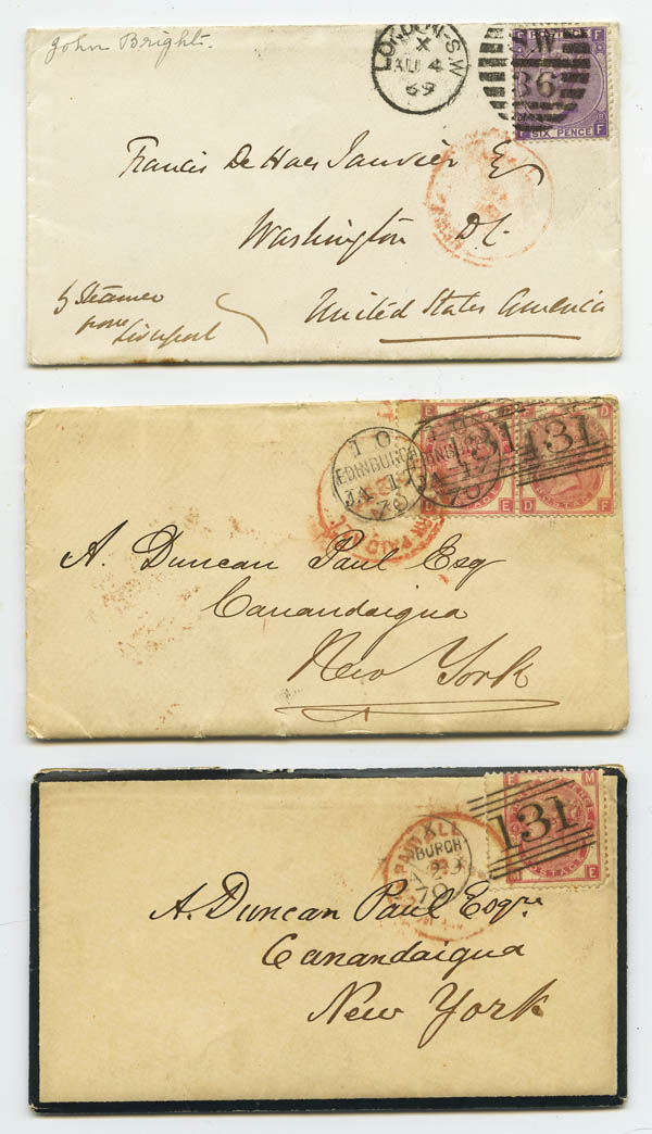 Lot 208![]() Great Britain, 1853-1901, a selection of Queen Victoria issues used on 13 foreign mail covers. Embossed issues include 1847 1s pale green (cut to shape) on an 1854 cover to India (£1900), and 1854 6d mauve (cut close or just in) on an 1855 Ship Letter to Sydney, Australia. Surface printed issues include 9 covers to the U.S.A. with 3d, 6d and 1s stamps, used 1861-1874 (£3560), the best being an 1870 cover to New York with a 3d pair (£750) and another 1870 cover with a single 3d (£500). There are also 2 later covers of less value (1890-1901). Condition is V.G. for the embossed issue covers and averages Fine for the surface printed. A nice lot for the postal history enthusiast. SG £7,300+ ($9,380). Estimate $500 - 750. |