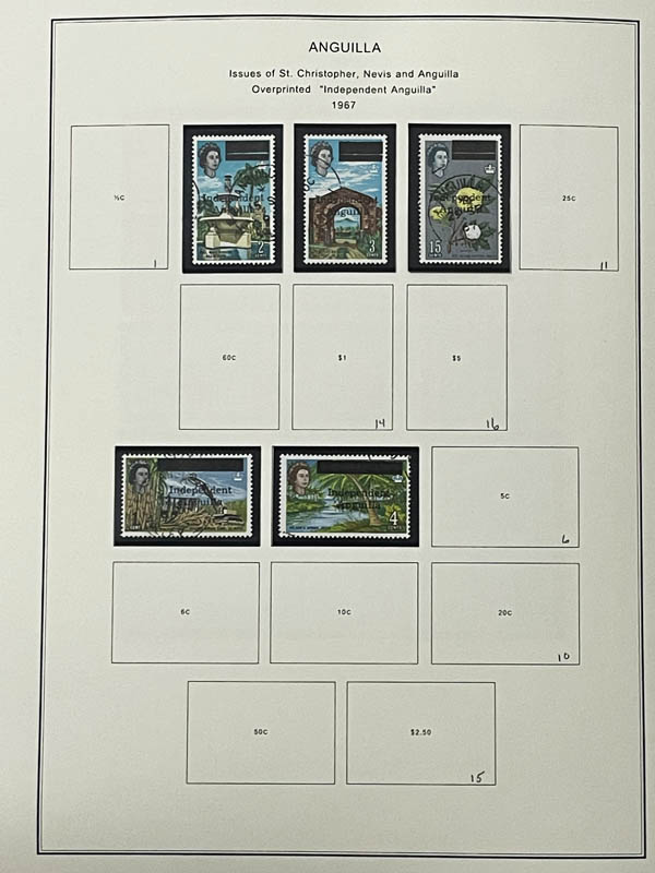 Lot 209![]() / /oAnguilla, 1967-87, a predominately mint collection, neatly mounted on pages and housed in a Palo 5-ring album with slip case, truly only a few used stamps on the first page the rest is mint, the earlier stamps are hinged and then later stamps are n.h.; a good portion of the pages are imaged to give a flavor of the lot! A nice modern issues collection with many attractive complete sets, generally Fine to Very Fine. Shipping weight 6.5 lbs / 3 kilos. Scott approximately $1,600. Estimate $200 - 300. |