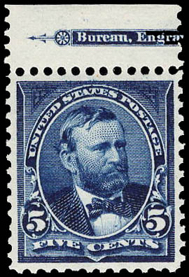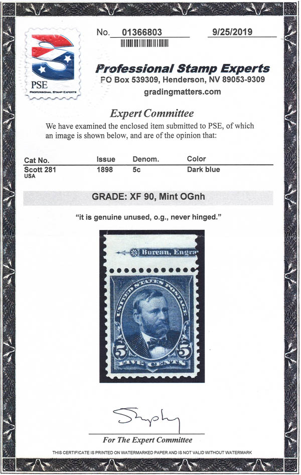 Lot 21![]() ![]() 1898, 5¢ Grant, dark blue (Scott 281), part imprint single, beautifully well centered, o.g., never hinged, Extremely Fine, with 2019 P.S.E. certificate graded XF 90. Scott $100. SMQ $325. Estimate $200 - 300. |