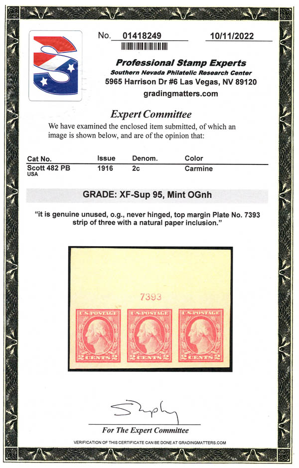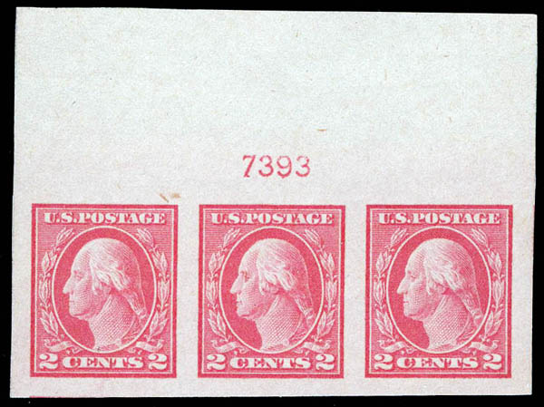 Lot 210![]() ![]() 1916, 2¢ Washington, carmine, type I, unwatermarked, imperf. (Scott 482), strip of 3 with plate number, o.g., never hinged, Extremely Fine to Superb, with 2022 P.S.E. certificate graded XF-SUP 95. SMQ $95 for pair and single. Estimate $75 - 100. |