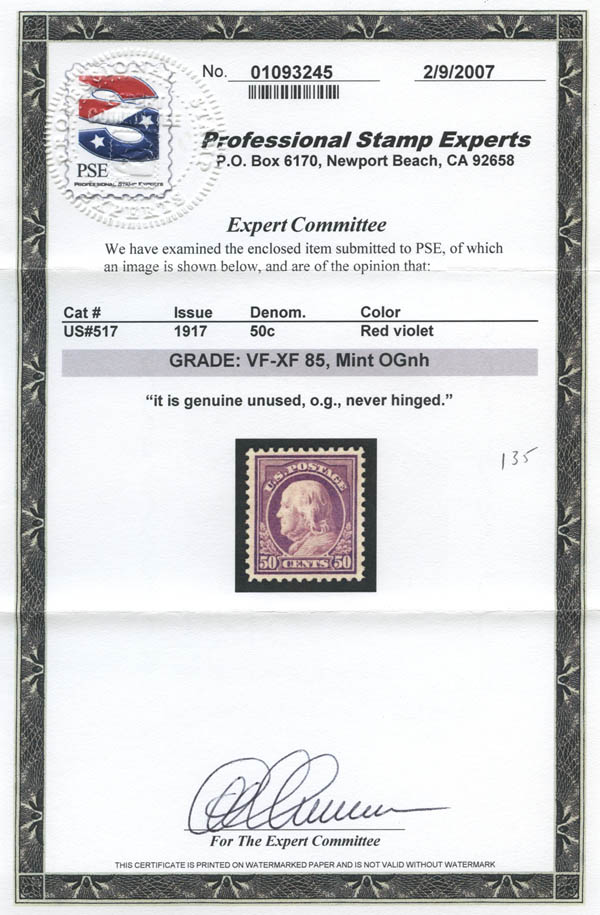 Lot 211![]() ![]() 1917, 50¢ Franklin, red violet, perf 11 (Scott 517), exceptionally well centered, very bright and fresh, o.g., never hinged, Very Fine to Extremely Fine, with 2007 P.S.E. certificate graded VF-XF 85. Scott $120. SMQ $135. Estimate $80 - 120. |