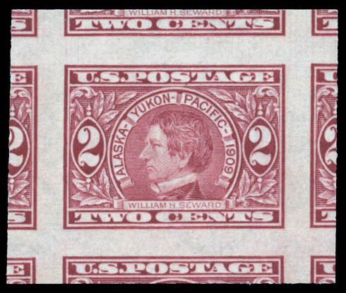 Lot 212![]() ![]() 1909, 2¢ Alaska-Yukon, imperf (Scott 371), a spectacular eye-popping jumbo showing parts of 8 other stamps - wow! o.g., never hinged, Superb, with 2019 P.S.E. certificate graded Gem 100J. Scott $30. SMQ $225 for plain 100. Estimate $300 - 400. |