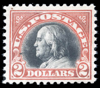 1918, $2 Franklin, orange red & black (Scott 523), o.g., very lightly hinged, Fine to Very Fine. Scott $525.