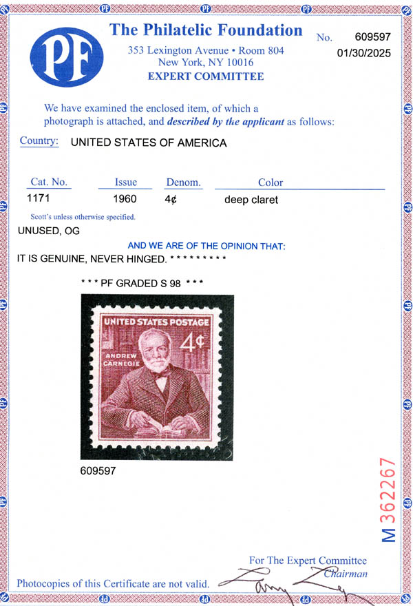 1960, 4¢ Andrew Carnegie (Scott 1171), o.g., never hinged, Superb, with 2025 P.F. certificate graded SUP 98. SMQ $65.