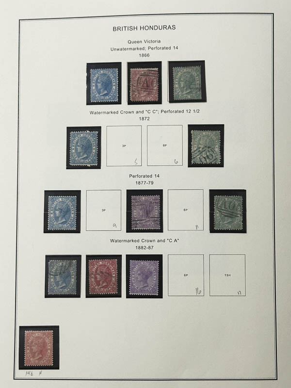 Lot 215 /oBritish Honduras, 1866-1972, a mint and used collection, neatly mounted on pages, the early issues in part sets, plus many King George VI and Queen Elizabeth II complete sets, and some semi-postals and postage dues. A nice lot for a collector, generally Fine to Very Fine. Shipping weight 1 lb / 0.45 kilos. Scott $2,000+. Estimate $250 - 350. |