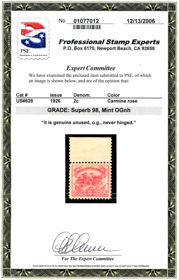 1926, 2¢ White Plains (Scott 629), a gem for the perfectionist, o.g., never hinged, Superb, with 2006 P.S.E. certificate graded SUP 98. SMQ $160.